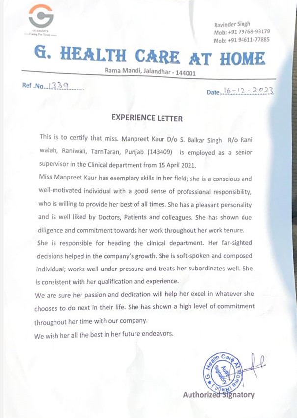 Worked at G. health care at home as a Senior Supervisor for 2 Year 8 Month starting Apr-2021 till Dec-2023